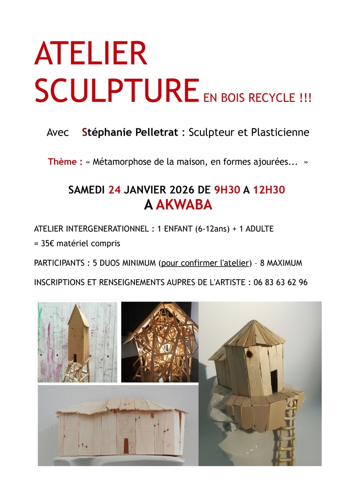 Rejoingnez Stéphanie Pelletrat, artiste plasticienne et sculpteur, pour confectionner votre propre objet de décoration en bois recyclé sur le thème Métamorphose de la maison, en formes ajourées, le 24 janvier 2026. Cet atelier intergénérationnel vous invite à participer en duo, composé d'un·e adulte et d'un enfant d'au moins 6 ans.