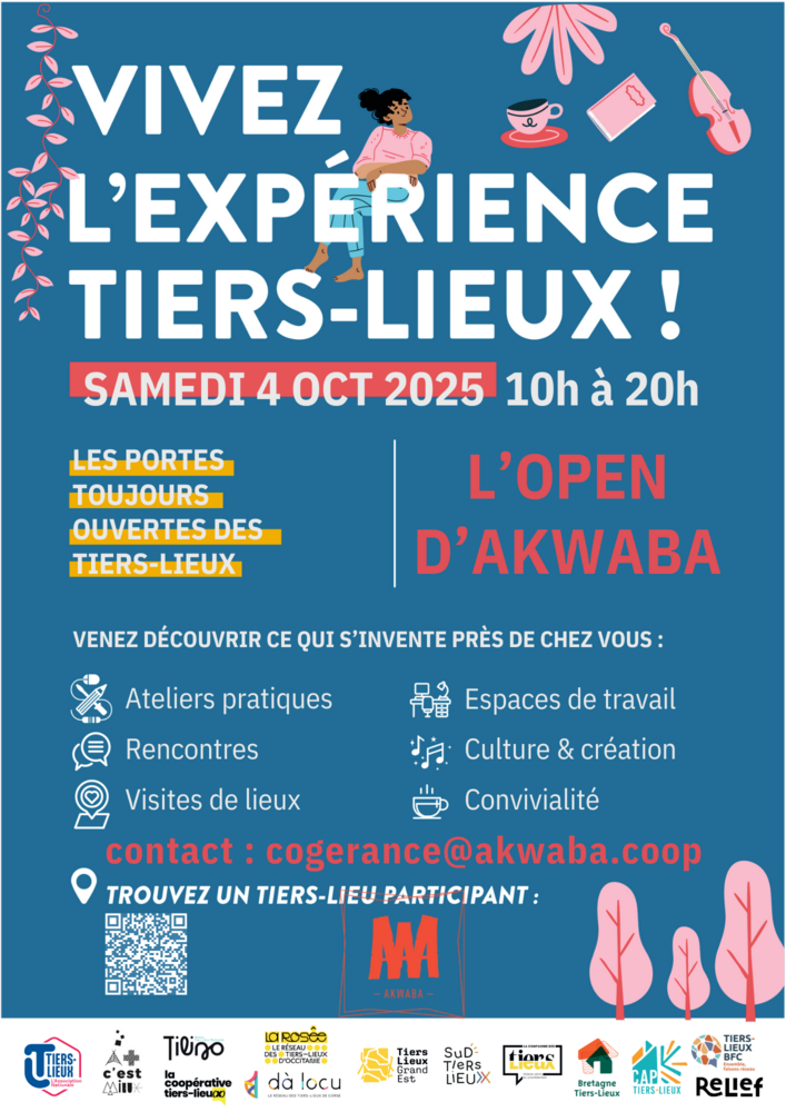 Et à Akwaba, on ouvrira aussi nos portes le Samedi 4 Octobre ! L'occasion de venir assister à des tables rondes autour du sujet Tiers-Lieu, écouter des artistes et grignoter un bout en bonne compagnie !